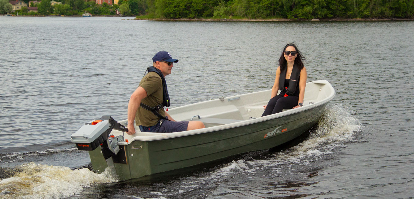 eSuvi 450 is a rainwater-draining rowing motorboat for the cottage and fishing. The boat can be kept moored thanks to the convenient draining mechanism. eSuvi 450 has the same hull design as eSuvi 444 and offers the same excellent rowing and handling performance. The detachable middle seat and even floor make moving around and transporting goods in the boat easy. Two lockable storage spaces.