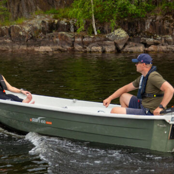 eSuvi 450 is a rainwater-draining rowing motorboat for the cottage and fishing. The boat can be kept moored thanks to the convenient draining mechanism. eSuvi 450 has the same hull design as eSuvi 444 and offers the same excellent rowing and handling performance. The detachable middle seat and even floor make moving around and transporting goods in the boat easy. Two lockable storage spaces.