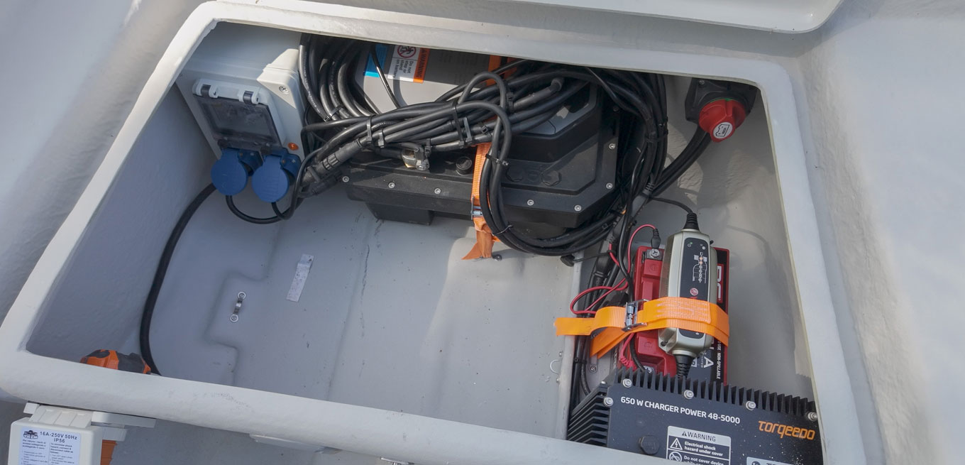 The boat is equipped with a 5 kWh battery and a smaller additional 12 V battery for accessories. Both batteries can be recharged simultaneously with the charging cable included in the delivery.