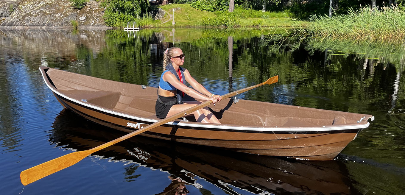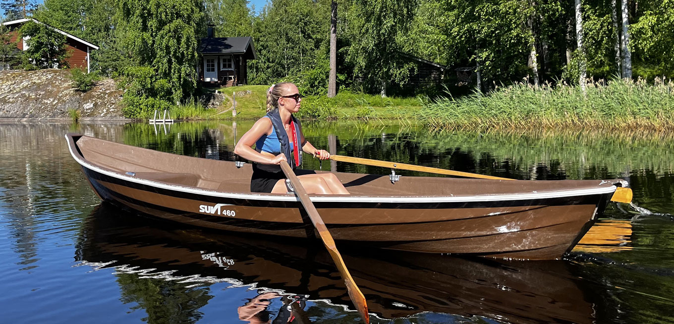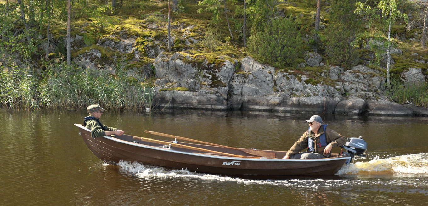 The “Terva” rowing boats are dark brown in colour, as the name suggests – terva is Finnish for “tar”. They provide a nice alternative to pale-coloured boats.The colour is a great fit in Nordic nature.Surface-treated or tar-coated oars with curved blades come as standard.Thanks to its hull bottom design, the SUVI 460 “Terva” can also be powered with an outboard.However, its excellent rowing characteristics have not been compromised, and its lateral stability has been improved.It is a safe and unsinkable boat that is well suited for use at the cabin, including fishing.The engine well and the aluminium edging strip come as standard, and there is a lockable storage compartment within the middle seat.The boat has been designed for short-shaft outboards.