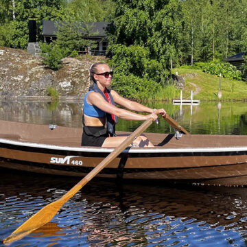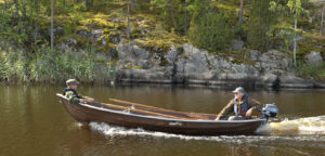 The “Terva” rowing boats are dark brown in colour, as the name suggests – terva is Finnish for “tar”. They provide a nice alternative to pale-coloured boats.The colour is a great fit in Nordic nature.Surface-treated or tar-coated oars with curved blades come as standard.Thanks to its hull bottom design, the SUVI 460 “Terva” can also be powered with an outboard.However, its excellent rowing characteristics have not been compromised, and its lateral stability has been improved.It is a safe and unsinkable boat that is well suited for use at the cabin, including fishing.The engine well and the aluminium edging strip come as standard, and there is a lockable storage compartment within the middle seat.The boat has been designed for short-shaft outboards.